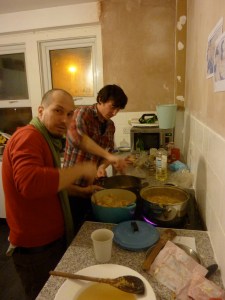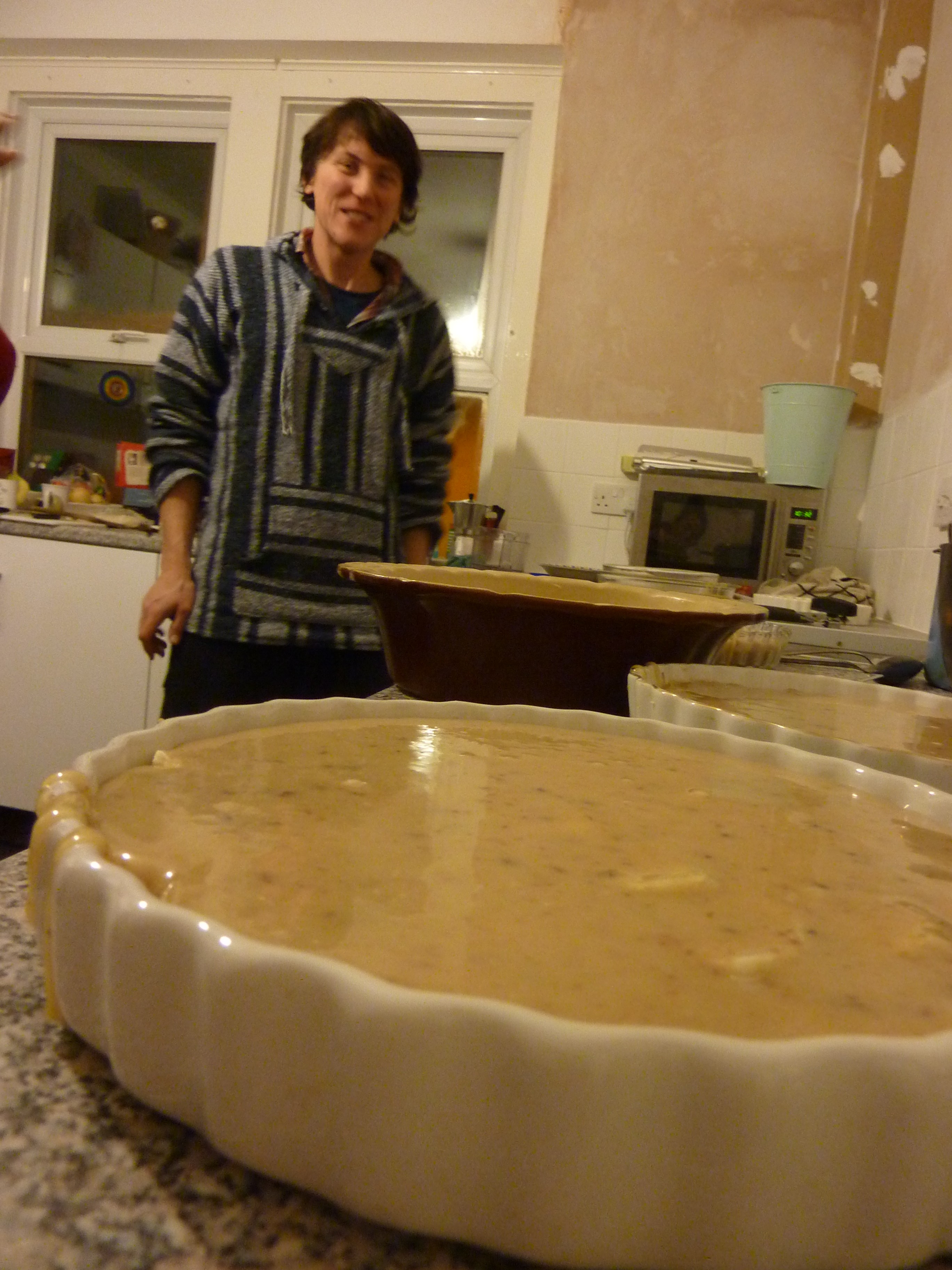 Instead of our usual Friday night of merriment, we had the curry night gurus Jay and Simonne as well as hard working Hayley and Sam over to help cook up the feast ahead of time. From 6pm to 11pm there were six of us madly chopping, peeling, whipping, stewing, stirring and of course drinking. By 11pm we had made 9 Banoffee pies, 6 cauldrons of chicken curry, 2 barrels of Dahl and a tasty chickpea dish specially for the vegetarians. Having all the food cooked Friday night meant that we had Saturday free to prepare the venue and ourselves for the arrival of our guests.