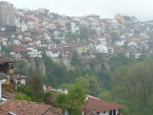 The road from Byala to Veliko Tarnovo was the main highway and it was very busy. As it entered the mountains it also became very narrow and windy. A few times we had to cycle up onto the verge while an enormous truck thundered past. Luckily it was not for long until and we arrived in Veliko Tarnovo, just after lunch. The town of Veliko Tarnovo has been built on and around the sides of a deep gorge with a river that snakes around it at the bottom. Many of the houses actually hang off the sides and you can be on one side, it was a truly amazing place to stay with some spectacular views of the gorges, old castles and churches.